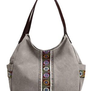 Worldlyda Women Canvas Hobo Purse Multi Pocket Tote Shopper Shoulder Bag Casual Top Handle handbag with Embroidery Ethnic