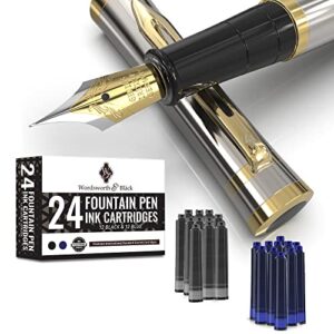 Wordsworth & Black Fountain Pen Set, 18K Gilded Medium Nib, Includes 24 Pack Ink Cartridges, Ink Refill Converter & Gift Pouch, Gold Finish, Calligraphy, [Silver Gold], Perfect for Men & Women