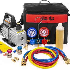 XtremepowerUS 3CFM 1/4HP Air Vacuum Pump HVAC R134a R12 R22 R410a A/C Refrigeration Kit AC Manifold Gauge R134 Can Tap Included Carrying Tote