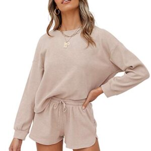 ZESICA Women Waffle Knit Long Sleeve Top and Shorts Pullover Nightwear Lounge Pajama Set with Pockets