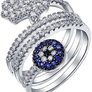 Amulet Talisman Yoga Blue CZ Pave Wrap Bypass Around Fashion Boho Statement Hamsa Evil Eye Band Ring for Teen for Women Silver Plated