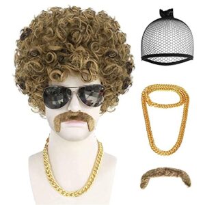 ANOGOL Wig Cap+{ 1 Gold Necklace + 1 Brown Beard } Short Black Gradient Brown Costume Wig Afro Curly Wigs 80s Wig for Men Halloween Christamas party