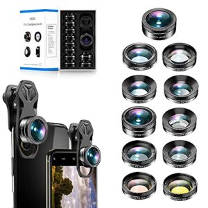 11 in 1 Universal Clip on Cell Phone Camera Lens kit. 205°Fisheye 140° Super Wide Angle 15X Macro Star CPL ND32 Kaleidoscope 4 Color Lens for iPhone Samsung Huawei and Most of Smartphone