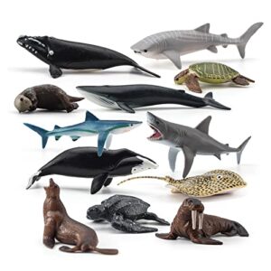 Atralo Service Ocean Sea Marine Animal Model Figures Playsets 12 PCS Realistic Mini Sea Animal Figure Toys Blue Shark Walrus Sea Lions Desktop Decoration Collection Party Favors Toys for Kids