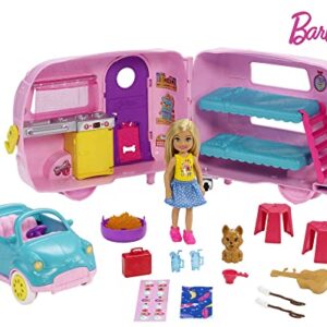 Barbie Club Chelsea Camper Playset with Chelsea Doll, Puppy, Car, Camper, Firepit, Guitar and 10 Accessories, Gift for 3 to 7 Year Olds