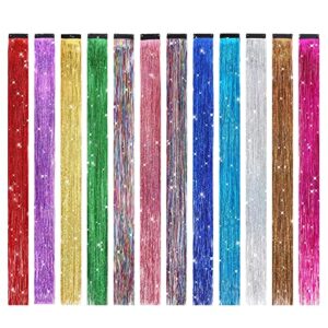 BHF 19 Inch Tinsel Hair Extensions 12 Colors Glitter Hair Extension Clip in Gold Sparkling Fairy Hair Tinsel Kit Shiny Highlights Colorful Heat Resistant Hair Accessories for Girls Xmas New Year Party