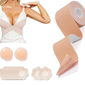 Boob Tape, Invisible Breast Lift Tap 2-Inch, water-proof and Sweatproof breast tape for A-E Cup Large Breast, with 5 Pairs Satin Breast Petals and 1 Pair Reusable Silicone Nipple Cover Nude