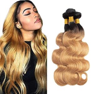 1B/27 Weave Bundles Ombre Body Wave Human Hair Bundles Brazilian Honey Blonde Bundles 2 Tone Black and Blonde Color 100% Unprocessed Brazilian Virgin Hair 3 Bundles 14 14 14 Inch