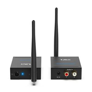 1Mii Wireless Transmitter Receiver Audio for Music, 2.4GHz Long Range Audio Transmitter and Receiver Low Delay from TV/ to Powered Speaker/ Stereo/ Subwoofer/ Soundbar/ RCA Out/in 320 ft-RT5066