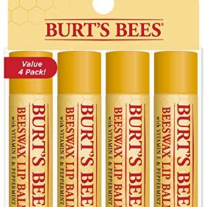 Burt Bees Lip Balm, Moisturizing Lip Care, 100% Natural, Original Beeswax With Vitamin E & Peppermint Oil 0.15 Ounce (Pack of 4)