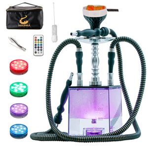 2 Hose Hookah Set with Travel Case Cleaning Brush, ASANMA Micro Cube Acrylic Hookah with Silicone Hookah Bowl 2 Hose Coal Tongs Magical Remote LED Light for Better Shisha Hookah Narguile Smoking
