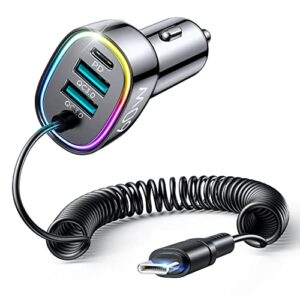 Car Charger USB C, 60W 4 Port Super Fast Charging Car Charger PD & QC 3.0 Multi-Port Car Adapter with 5.3ft Type C Coiled Cable, Cigarette Lighter USB Charger for Samsung Galaxy S22/S21/iPhone/Android