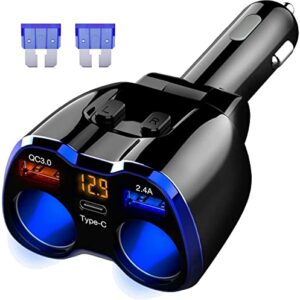 Car Charger, 150W 2-Socket Cigarette Lighter Splitter QC 3.0 Dual USB Ports 1 USB C Fast Car Adapter with Separate Switch LED Voltmeter Replaceable 15A Fuse for GPS/Dash Cam/Phone/iPad