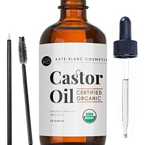 Castor Oil (2oz), USDA Certified Organic, 100% Pure, Cold Pressed, Hexane Free by Kate Blanc Cosmetics. Stimulate Growth for Eyelashes, Eyebrows, Hair. Skin Moisturizer & Hair Treatment Starter Kit