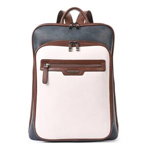 CLUCI Womens Laptop Backpack Leather 15.6 inch Computer Backpack Business Large Travel Daypack Vintage College Bag Dark blue with beige