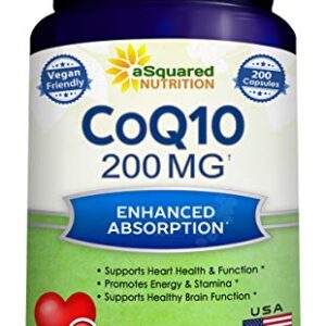 CoQ10 (200 Capsules and 200mg) – High Absorption Vegan CO Q-10 Powder – Enzyme Ubiquinone Supplement Pills, Extra Antioxidant Coenzyme Q10 Vitamin Tablets, Coq 10 for Healthy Blood Pressure & Heart