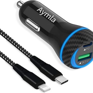 20W Fast USB C Car Charger, Aymla Compatible for iPhone 14/13 Pro/Max/Mini/12/11/XS/X/XR/8/Plus/SE 2020/iPad/Air, Rapid Charging Automobile Charger PD(PPS)&QC 3.0 Car Adapter – 3FT MFi Certified Cable