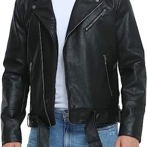 Fahsyee Leather Jackets for Men, Faux Bomber Jacket Men Motorcycle Lapel Asymmetric Zip-Up Blet Slim Fit Biker Coat