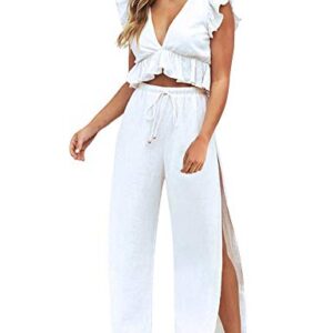FANCYINN Womens 2 Pieces Outfits Deep V Neck Crop Top Side Slit Drawstring Wide Leg Pants Set Jumpsuits