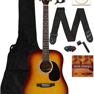 Fender Squier Dreadnought Acoustic Guitar – Sunburst Learn-to-Play Bundle with Gig Bag, Tuner, Strap, Strings, Picks, String Winder, Fender Play, and Austin Bazaar Instructional DVD