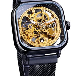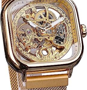 FORSINING Automatic Watches Mechanical Wrist Watch Golden for Mens Skeleton Watches with Stainless Steel Transparent Dial with Royal Flower Movement Carving