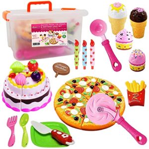 FUNERICA Pretend Cutting Play Food Kids Toy Set with Cutting Pizza, Ice Cream, Fries, Dessert, Storage Box & Toy Birthday Cake for Boys & Girls Party Celebrations, for Toddlers Learning