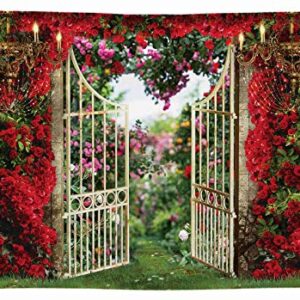 Funnytree 7x5FT Spring Garden Backdrop Red Rose Valentine Day Flower Vintage Landscape Background Wedding Couple Bridal Shower Party Supplies Decor Banner Photography Prop Photobooth Soft Fabric