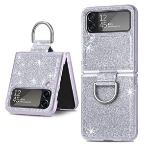 Galaxy Z Flip 4 Case with Ring,Samsung Galaxy Z Flip 4 Luxury Glitter Shiny PU Leather Wallet Slim Thin Crystal Hard PC Shockproof Protective Phone Case for Samsung Galaxy Z Flip 4 5G Sliver