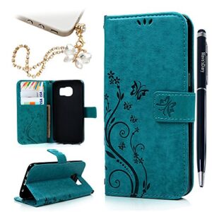 Galaxy S7 Edge Wallet Case – Mavis Diary Fashion Floral Butterfly Embossed PU Leather Magnetic Flip Cover Card Holders & Hand Strap for Samsung Galaxy S7 Edge with Bling Dust Plug & Pen (Blue)