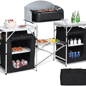 Giantex Camping Kitchen Station, Folding Grill Table with 26 Tabletop, 2 Side Tables, Storage Organizer, Detachable Windscreen, Portable Camp Cook Outdoor Prep Station Backyard BBQ Picnic (Black)
