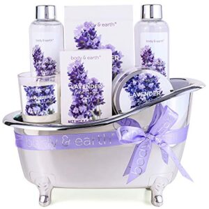 Gift Set for Women, Gift Basket for Women, Body & Earth Women Bath Set 7 Pcs Lavender Spa Basket with Shower Gel, Bubble Bath, Bath Salts, Body Lotion, Scented Candle, Gifts for Women