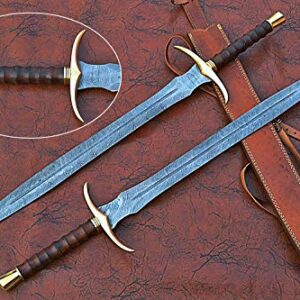 32 inches Long Sting Sword, 22″ Long Hand Forged Damascus Steel Double Edge Blade, Brass Cross hilt Forward and Pommel, Walnut Wood Serrated Grip, Leather Scabbard with Shoulder Stripe