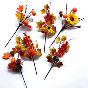 HANTURE 6 Pcs Artificial Fall Berry Picks Fake Orange Pumpkin Stems Assorted Faux Maple Leaves Branches with Sunflower Pumpkin Autumn Floral Twigs Bouquet Thanksgiving Home Decor