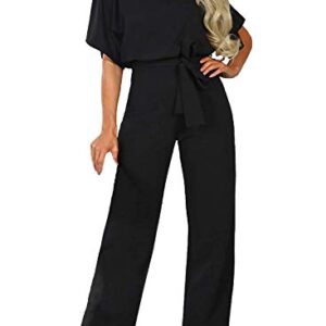 Happy Sailed Women Casual Loose Short Sleeve Belted Wide Leg Pant Romper Jumpsuits