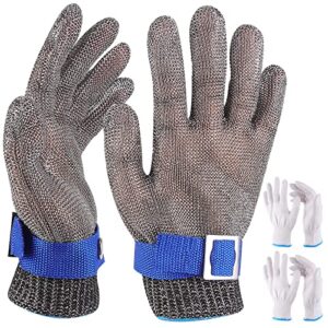 Herda 1 Pair Level 9 Cut Resistant Gloves, Stainless Steel Safety Kitchen Cuts Glove and 2 Pairs White Nylon Gloves for Meat Cutting, Fish Fillet Processing, Oyster Shucking Butcher Work Gloves (L)