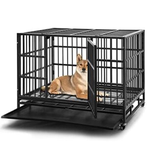48 inch Heavy Duty Indestructible Dog Crate Steel Escape Proof Dog Cage Kennel for Medium Large Dogs Indoor Double Door High Anxiety Dog Crate with Wheels, Lock& Removable Tray, Black