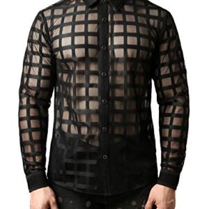 JOGAL Men Mesh Fishnet See Through Lace Sheer Button Down Shirts