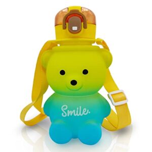 Kawaii Water Bottle Teddy Bear Water Bottles with Straw Kawaii Bear Straw Bottle with Adjustable Strap, Portable Leakproof BPA-Free Drinking Cups for Girls School Sports Travel (27oz, Yellow/Blue)