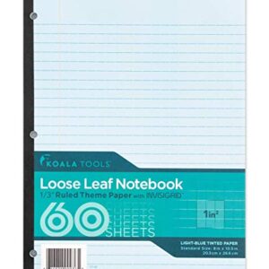 Koala Tools | Loose Leaf Notebook 1/3″ (Wide) Ruled Theme Paper with Invisigrid – Light-Blue Tinted Paper – 60 Sheets – 10.5″ x 8″ – 3 Hole Punched, Tape Bound Notebook