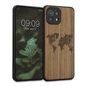 kwmobile Wood Case Compatible with Xiaomi 11 Lite (5G) NE/Mi 11 Lite (5G) – Phone Case with TPU Bumper – Travel Outline Dark Brown