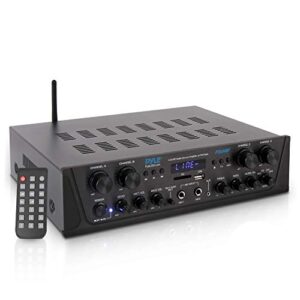 500W Karaoke Wireless Bluetooth Amplifier – 4 Channel Stereo Audio Home Theater Speaker Sound Power Receiver with AUX IN, FM, RCA Subwoofer Speakers OUT, USB, Microphone IN with Echo – Pyle PTA44BT