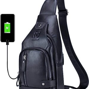 Leather Sling Bag Mens Chest Bag Casual Shoulder Crossbody Bags Travel Hiking Backpacks Daypack with USB Charging Port (Black)