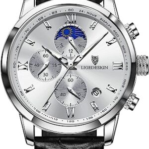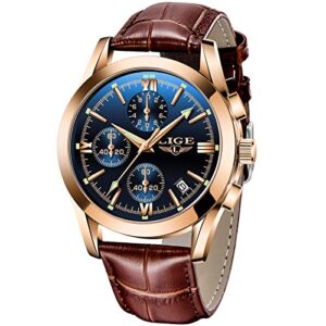 LIGE Men Watches Elegant Luxury Analog Quartz 3ATM Waterproof Chronograph Watch for Male Fashion Casual Leather Round Big Dial Calendar Business Gents Dress Wristwatch