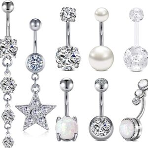 Longita Silver Belly Button Rings for Women Surgical Stainless Steel 14g Opal Pearl Sparkling Diamond Sexy Dangle Belly Ring Navel Piercing Jewelry 10mm Pack