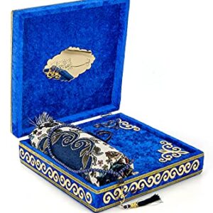 Luxury Islamic Prayer Velvet Covered Gift Box, Deluxe 4 Piece Set with Elegant Velvet Covered Quran & Prayer Beads Tesbih & Prayer Rug, Ramadan & Eid Gift, Navy Blue