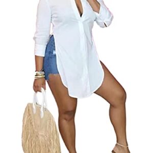 LYANER Women Collar V Neck Button Front Long Sleeve Slit Hem Long Shirt Blouse Top
