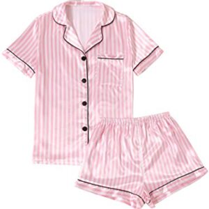 LYANER Women Striped Silky Satin Pajamas Short Sleeve Top with Shorts Sleepwear PJ Set