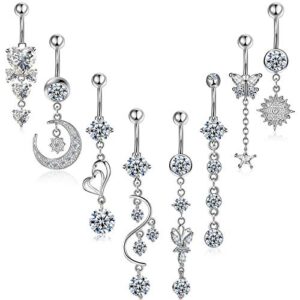 8 Pieces 14G Belly Button Rings Steel Long Dangle Navel Ring CZ Body Piercing Jewelry (Gold)