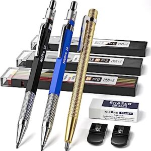 Nicpro Mechanical Carpenter Pencils Set 2.0 mm, Carbide Scriber Tool with 36 Marker Lead Refills Black &Colors, Erasers, Sharpener for Ceramics, Woodworking, Glass, Hardened Steel
