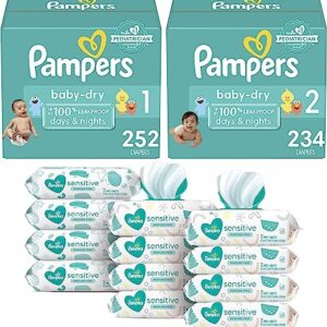 Pampers Baby Dry Disposable Baby Diapers Starter Kit (2 Month Supply), Sizes 1 (252 Count) & 2, (234 Count) with Sensitive Water Based Baby Wipes, 12X Pop-Top Packs (864 Count)